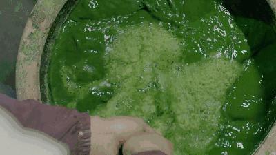 选择谷雨前最嫩的艾草。,拔掉整棵树,青绿色的嫩叶经冷压压榨,一方面保留了幼苗的营养成分和香味,另一方面清澈翠绿煞是美丽的,用来给青团上色也是不错的。