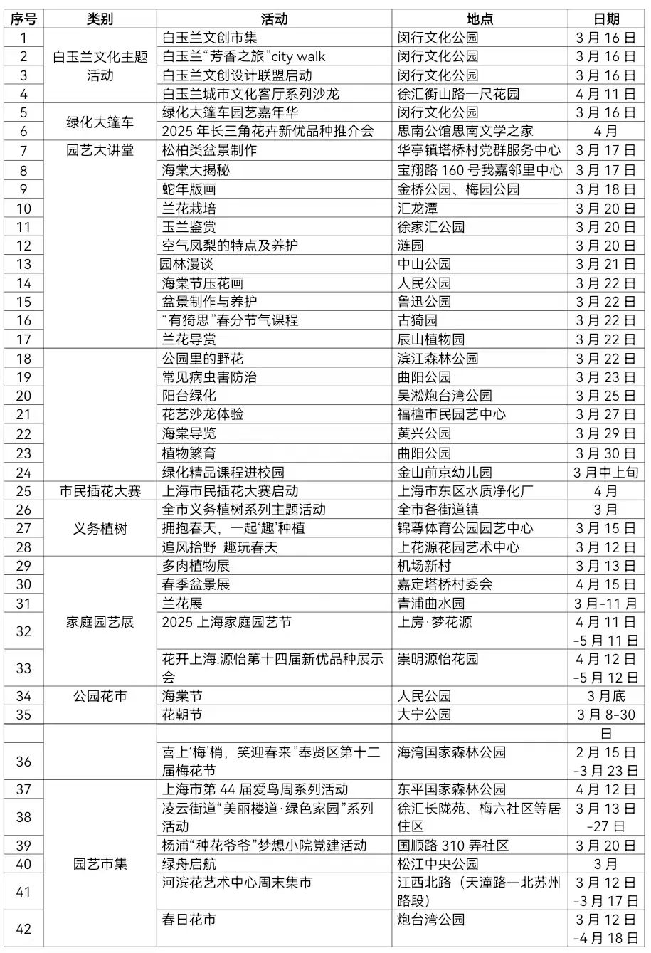 据市绿化市容局介绍,2025年上海市民绿化活动月暨白玉兰文化活动于3月16日至4月15日举行。主要活动包括8大类40多个系列活动,内容丰富多样。除了2025年上海市民绿化活动月绿化篷车、园艺讲堂、市民插花大赛等传统品牌外,还增加了白玉兰文化活动、义务植树、家庭园艺展览、公园花市、园艺市场等。详细↓