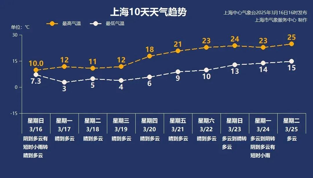 本周,上海整体晴天多雨少。受冷空气影响,周初风力较大,气温在3~12℃。从周四开始,气温急剧上升。预计周末最高气温将上升至24℃,昼夜温差将扩大,日温差将超过10℃。初春,刚开始很暖很冷。请关注临近天气预报,及时增减衣服,谨防感冒。