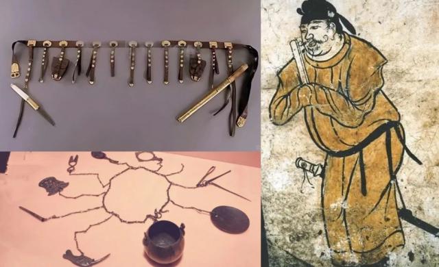 一种腰带在唐代很流行蹀躞带,这条腰带上有一排小钩子,但是可以挂各种挂件,比如刀、茶壶等等。《旧唐书》中有七件事,包括佩刀、刀、磨石、契真、耳朵、针管、火石袋等。补脑:武术家带着这些,走路也很时尚。