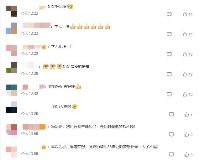 "本以为岁月消磨了理想,冯奶奶却用88年证实了理想常青,太神奇了!"