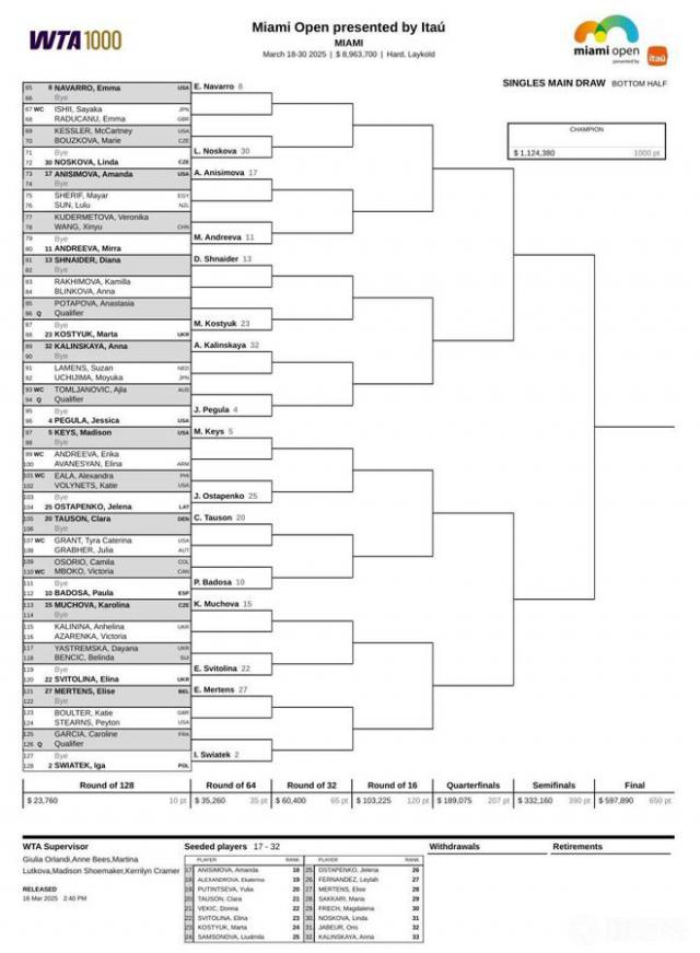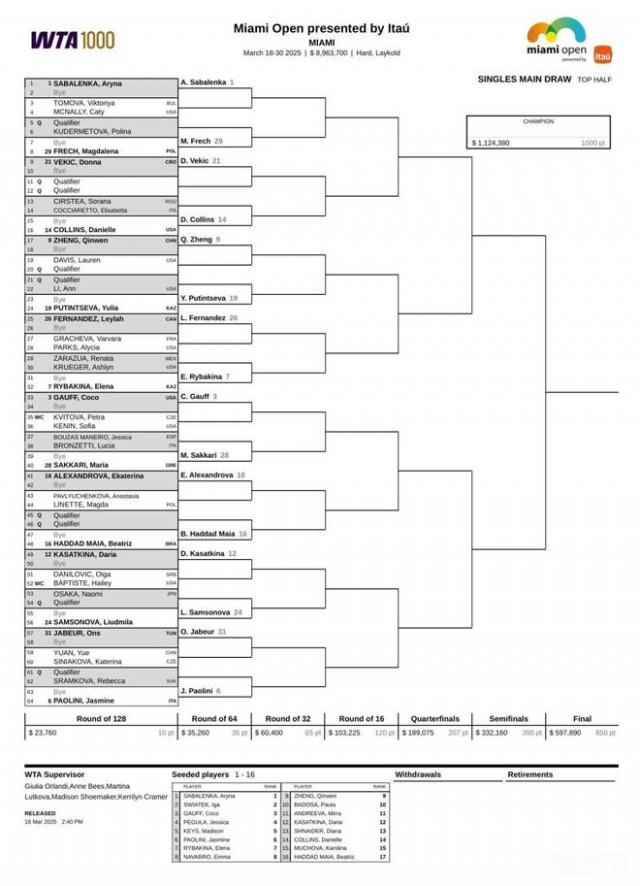 北京时间 3 月 17 日凌晨,2025 年度网球迈阿密大师赛女单签表公布,9 中国种子选手郑钦文获得了“炼狱”级别的签表,上半部分与莱巴金娜萨巴伦卡同在。如果他能最终赢得冠军,他可能需要在世界之前赢得连胜。 3 的高手。