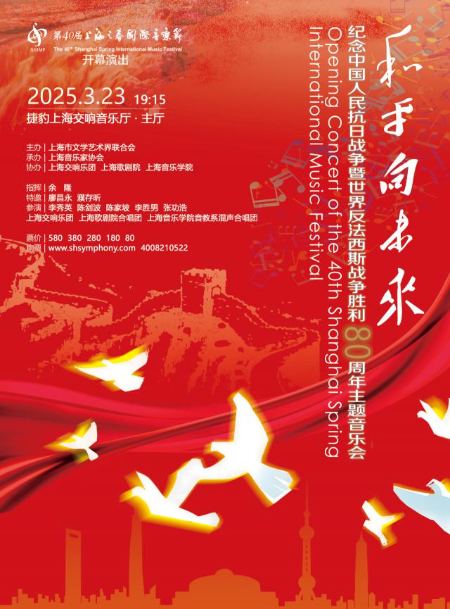 第 40 以“春天的回响”为主题的上海之春国际音乐节将举办一系列活动,如原创作品选拔、国际文化交流、优秀项目表演等。其中,开幕式表演以“和平未来”为主题,选择了《红旗颂》《中国,我可爱的妈妈——为大型合唱团和交响乐队而作》《黄河合唱》等经典作品,体现了救亡图存和民族复兴。表演由著名指挥家余隆执行,上海交响乐团、上海歌剧院合唱团、上海音乐学院音教系混合合唱团呈现。与此同时,著名歌手廖昌永、著名艺术家濮存昕等中青年艺术家被邀请出演。