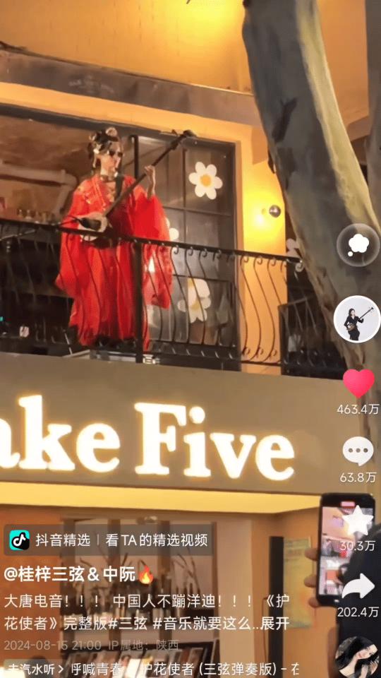 桂梓三弦&中阮?,抖音粉丝110万 ,天津市非物质遗产音乐大三弦代表性传承人,毕业于天津音乐学院、天津音乐家协会会员,天津市荣成国艺教育创始人。2024年8月,在TikTok上发布了一段视频“中国人不跳洋迪!!!云想着衣服和鲜花,墨镜三弦Rock and Roll!》,单个视频获得了超过500万的赞誉。