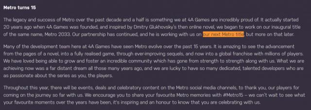 在过去 15 年中,《地铁》系列的财产和成功是我们 4A Games 团队引以为豪的成就。实际上,这一切都是从 20 年前,当时 4A Games 成立,并且被接受 Dmitry Glukhovsky 在网络小说的启发下,我们开始打造第一款同名游戏“地铁” 2033》。到目前为止,我们的合作一直持续到现在,他正在和我们一起开发下一部《地铁》作品,但这一点稍后再谈。