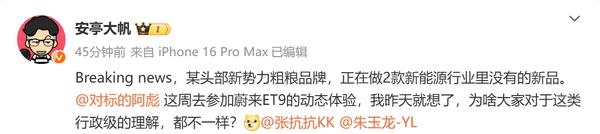 【CNMO 科技新闻】近日,一位汽车博主透露,一个头部新力量粗粮汽车品牌(外界普遍猜测是小米)正在秘密开发两款新能源市场前所未有的新产品。据博主介绍,这两款新车在燃油车领域有类似的产品类型,但具体细节尚未公开。