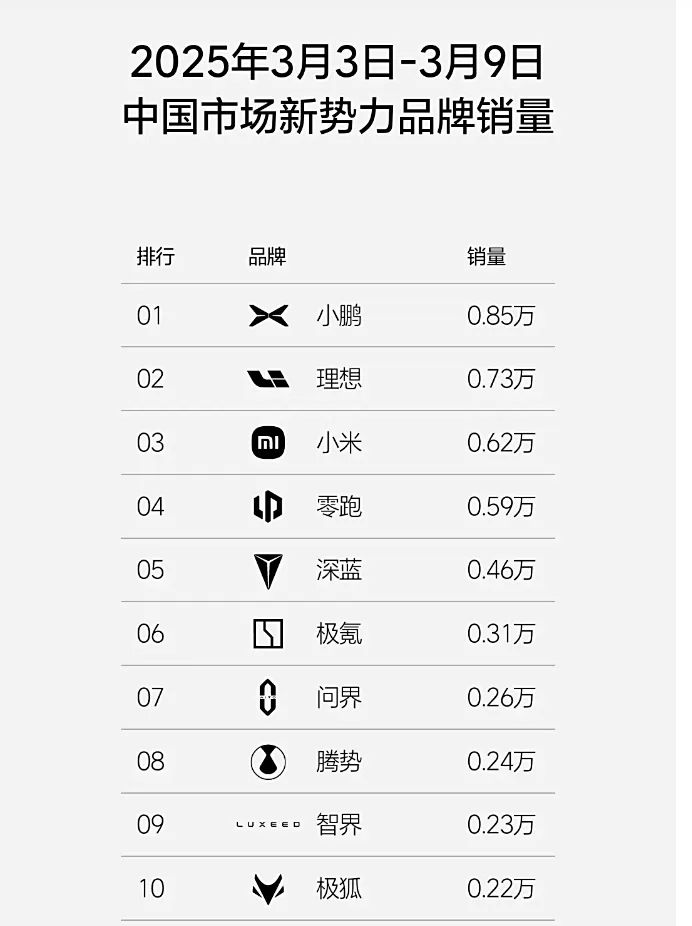 最近,新能源汽车公司和新力量品牌再次发布了新的周销售清单。