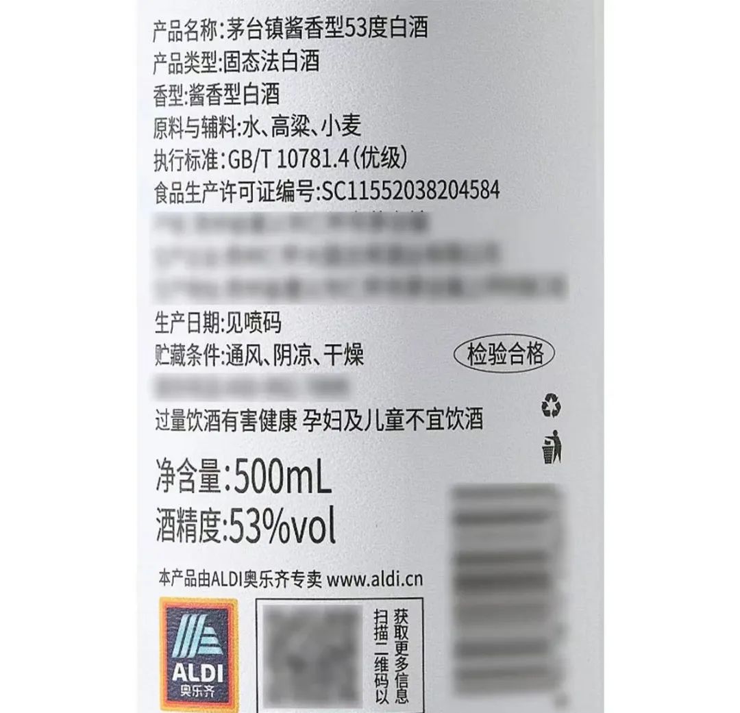 继2024年6月,奥乐齐推出一款9.9元浓香型白酒点燃行业后,今年3月初,奥乐齐悄悄将一款酱香型纯粮型白酒放在店内,标准容量500mL,符合酱香型白酒推崇的53°酒精含量,并特别注明采用“大曲坤沙”酿造工艺。其玻璃瓶设计采用不透明的白瓷材料和瓶体造型,类似天妃茅台。