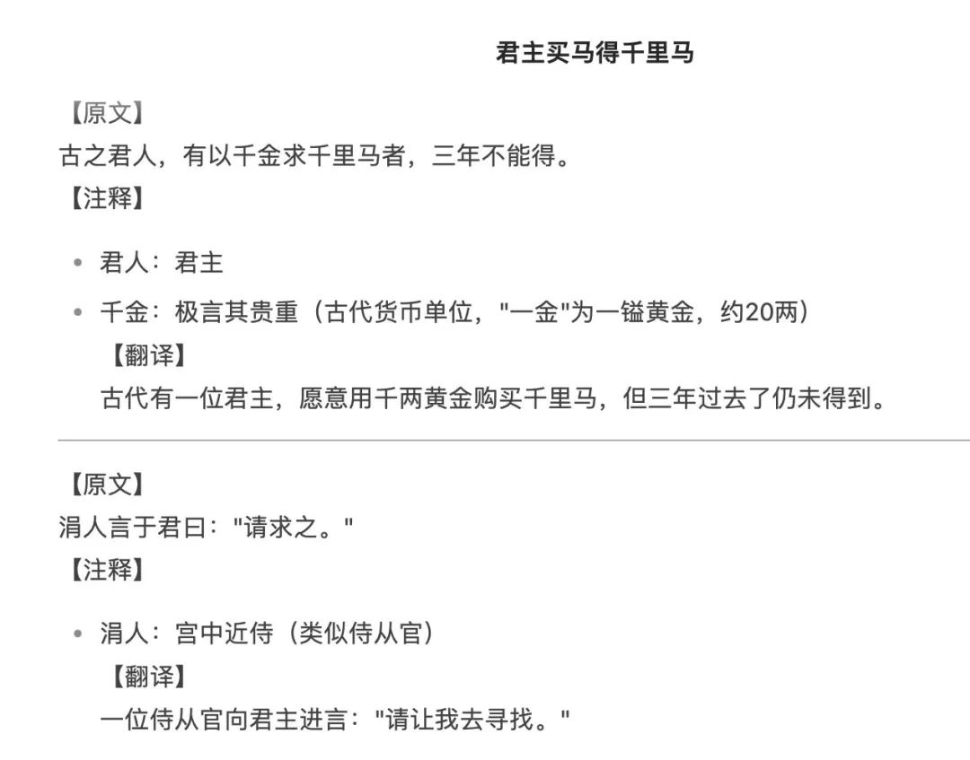 两者给出的翻译模式不同。DeepSeek是一个逐句翻译,每次翻译一个句子,都会独立列出句子中一些关键词的解释,比如“要求的人生马,要求死马捐五百金”。DeepSeek列出了“为什么要做”和“捐:消费”的注释,有利于想要详细解释的父母。腾讯元宝直接给出了一个翻译。虽然它没有像DeepSeek那样给出关键词解释,但它给出了“典故分析”来分析寓言揭示的核心思想。的确,提炼文言文的主题也是不可或缺的能力。