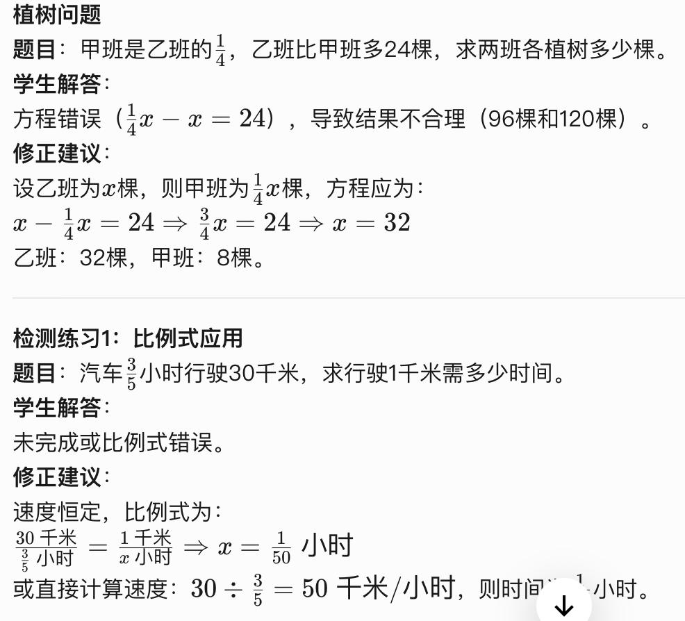 但是,DeepSeek和腾讯元宝都会总结出错误的问题,腾讯元宝不仅列出了每个问题的错误点,还总结了整体的错误情况,如比例分配顺序错误、方程设置逻辑混乱、单位转换和计算粗心等。同样,DeepSeek还分析了每个问题的错误点,并总结了比例分配、方程开设、分数运算等需要加强的内容。在总结错误点方面,两者的观点基本一致,但腾讯元宝总结得更仔细,每一点都有错误的例子和解决方案,可以看出错误的根源。