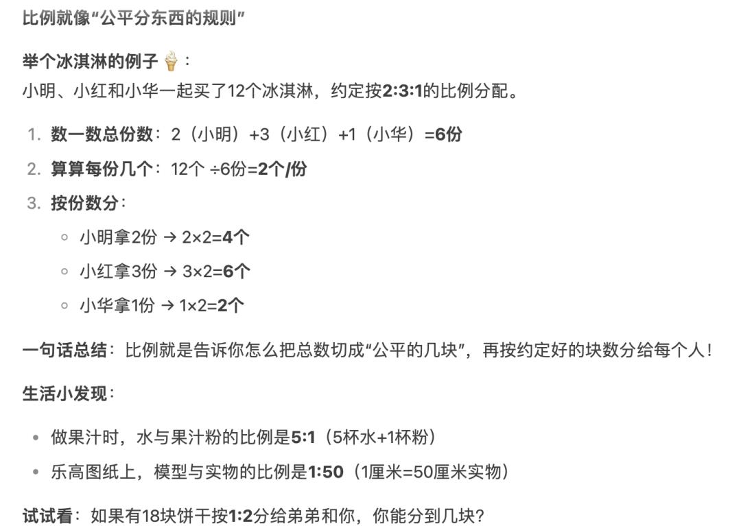 除做题外,对数学概念的理解非常重要。"用通俗易懂的方式解释比例的概念", DeepSeek和腾讯元宝都是用“比例像‘放大缩小器’或者‘公平调节器’”来形容的。这是腾讯元宝的比喻。它列出了蛋糕、地图等常见场景,也反映了比例的三个关键点:顺序不能混乱,可以用分数来表达,可以简化。最后总结的比例是“按规矩办事”,只要遵循同样的比例。无论放大缩小都没有错。