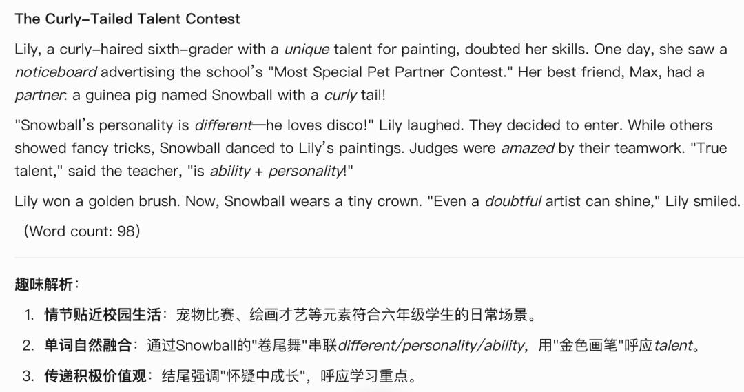 《IT时报》记者从六年级英语书籍中选取了10个单词,其中包括special、talent、Personality等,让DeepSeek和腾讯元宝用这些词来创作一篇有趣的文章,字数为100-120字,内容要符合六年级学生的水平。两个AI创作的主题基本一致。他们写了一场才艺展,传达了“每个人都是独一无二的自己”的价值观,从文章的难度来看相对适中。从呈现来看,DeepSeek加粗了10个单词,比腾讯元宝更直观。