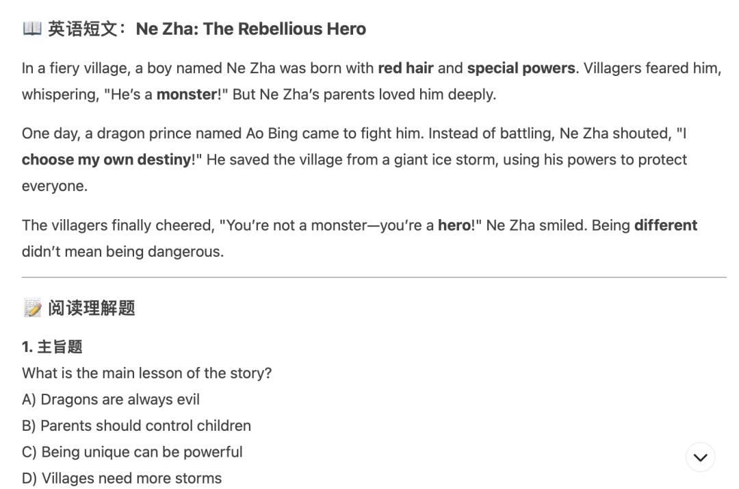 在中学生的英语试卷中,阅读占了一定的比例,这使得DeepSeek和腾讯元宝产生了一个适合六年级学生的阅读理解,主题是电影《哪吒》,并产生了五个主题。DeepSeek和腾讯元宝不约而同地将之前给出的10个单词中的部分融入到文章中,但是主题不同。DeepSeek在电影中描绘了一个场景,腾讯元宝概述了整部电影的内容,并对其进行了评价。从内容上看,腾讯元宝更符合提问者的意图。从题目来看,有主题题、细节题、词汇题、推理题等类型,都是以选择题的形式出现,符合考试的招数,但腾讯元宝还是没有给出答案。