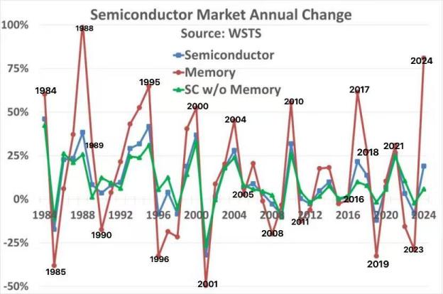 下面的图表是根据WSTS数据绘制的,它显示了近40年来存储市场的周期性波动。