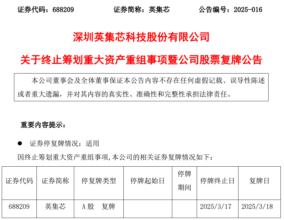 三月十七日晚,英集芯宣布,该公司决定终止筹备重大资产重组事项,计划从三月十八日开市起复牌。