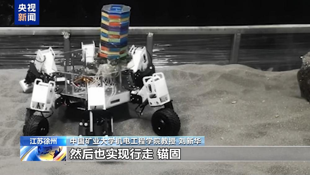 中国矿业大学机电工程学院教授 刘新华:我们实现了这种微重力的等效试验,这种机器人可以在模拟月壤的环境中行走、锚定,甚至取样。