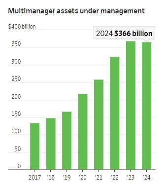 多策略基金通常是指雇佣数百个半独立的投资团队来交易各种证券和衍生品,以产生稳定的收益。高盛表示,虽然到2023年,它们只占行业资产的9%左右,但它们占对冲基金行业股市足迹的30%左右。这一规模促使他们的投资决策对更广阔的市场产生了巨大的影响。截至2024年中期,管理总资金已达3660亿美元。