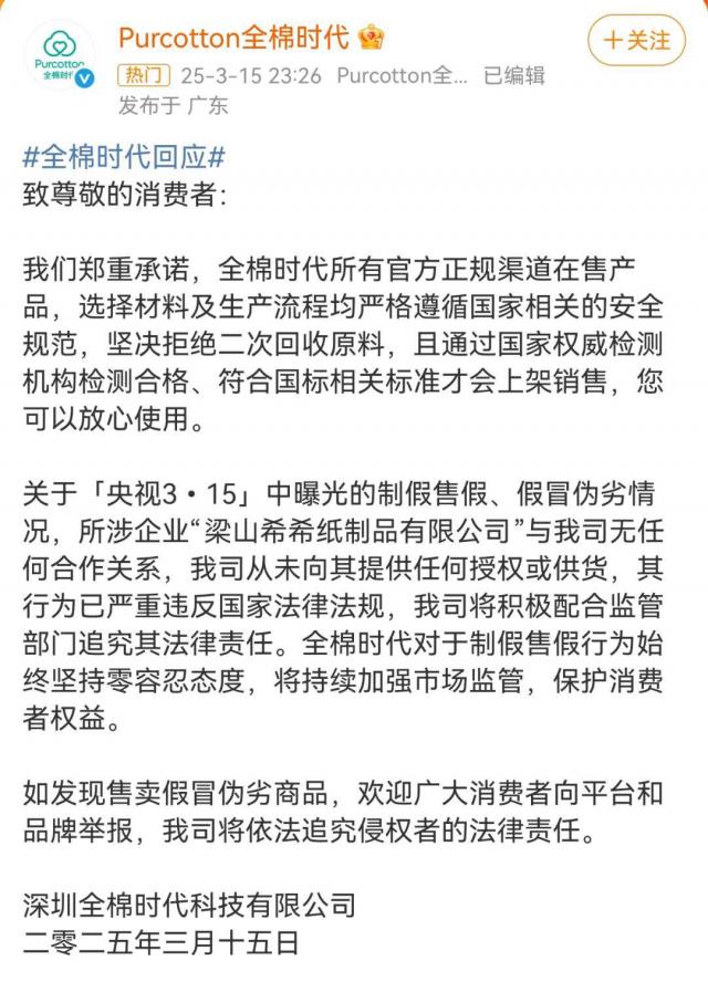 棉花时代:“梁山希希纸制品有限公司”与我公司没有任何合作关系,我公司从未向其提供任何授权或供货。