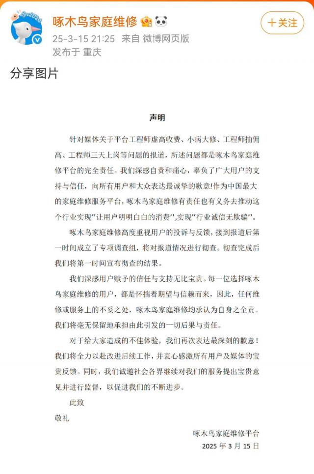 根据央视新闻,重庆市市场监督管理局发布通知,派出稽查人员。 80 余人入驻重庆啄木鸟网络科技有限公司总部及其分子公司,重点调查维修工人的抽奖规则、员工培训、对外宣传、业务推广、零部件产品质量等。