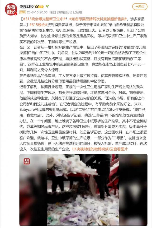 3·15 晚会曝光梁山希希纸制品有限公司销售劣质卫生巾、婴儿纸尿裤。