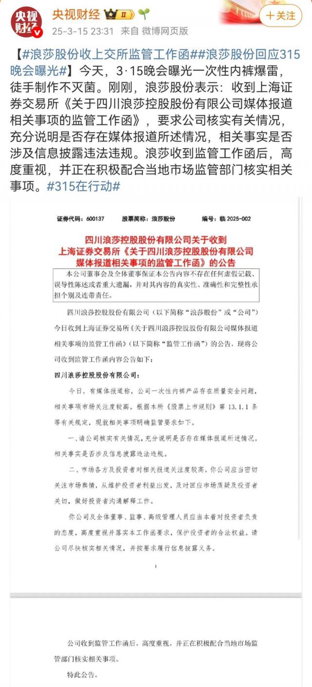 浪莎股份表示:收到上海证券交易所《关于四川浪莎控股有限公司媒体报道相关事项的监管函》,要求公司核实相关情况,充分说明上述情况是否存在媒体报道,相关事实是否涉及信息披露是否违法。收到监管函后,浪莎高度重视,积极配合当地市场监管部门核实相关事宜。