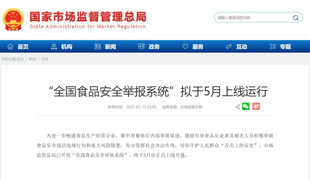 据国家市场监督管理总局消息,为进一步畅通食品生产经营公司内部举报渠道,鼓励引导食品从业者及相关人员积极举报食品安全违规行为和重大风险隐患,充分发挥社会共治作用,切实守护人民群众“舌尖上的安全”,市场监管总局已开发“全国食品安全举报系统”,将于5月正式上线。