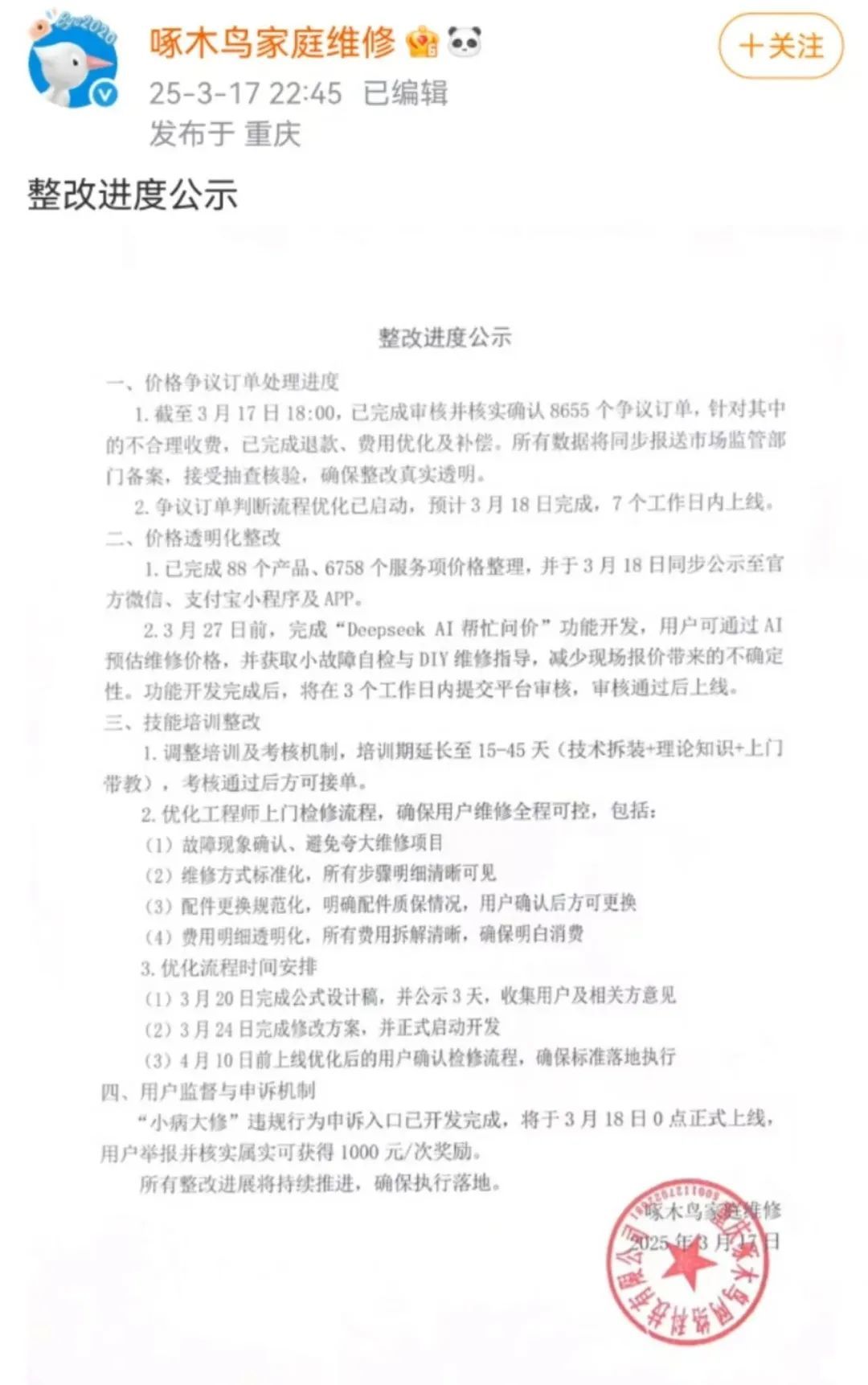 三月十六日晚,啄木鸟再次道歉,发布《整改承诺书》:从现在开始,我们将全面推进整改措施,接受所有员工的监督。对于最近的价格纠纷订单,平台将分阶段进行审查。平台将在维修期内首批处理投诉订单,平台将主动找客户进行无条件全额退款。经核实有欺诈收费、恶意误导用户的维修工程师将被列入平台黑名单,永久禁止。