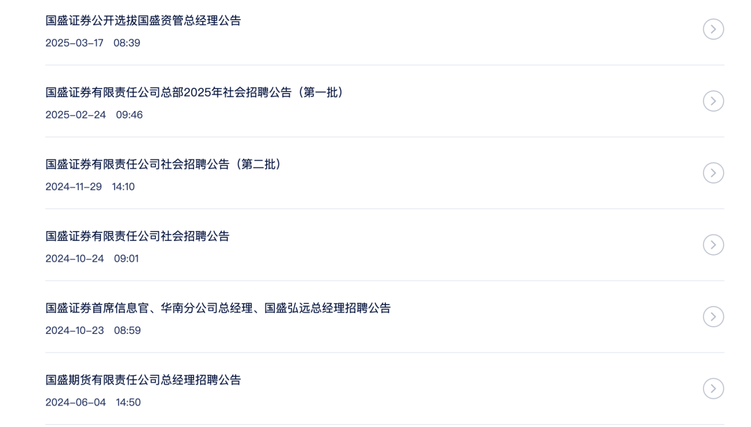 记者注意到,这次公开选聘延续了近几年国盛证券人才强企战略转型的方向。从去年开始,国盛证券开始了多轮公开选聘。比如2024年6月,国盛期货总经理公开招聘给社会;2024年10月,郭盛证券首席信息官、郭盛证券华南分公司总经理、郭盛弘远总经理公开招聘;2025年2月,由于发展需要,公开招聘12人,包括固定收入总部、金融系统总部、研究所等部门。