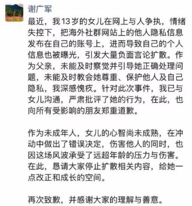 谢广军说:“我 13 一岁的女儿在网上和别人吵架,情绪失控,在自己的账号上发布了海外社区网站上的他人隐私信息,导致个人信息被曝光,导致大量负面言论传播。作为一个父亲,她没有及时发现和引导她妥善处理问题,也没有及时教会她尊重和保护他人和自己的隐私。她深感愧疚,向所有受影响的朋友郑重道歉。"