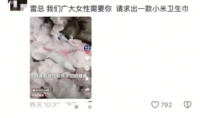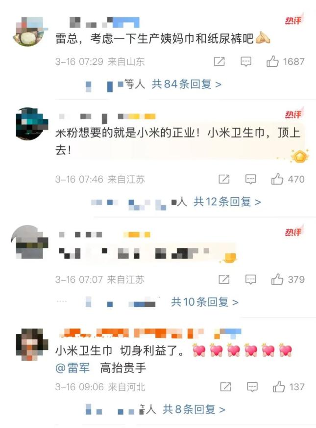 日前,不少网友前往小米董事长兼首席执行官雷军的每一个社交平台账号留言,希望小米能够生产卫生巾、纸尿裤等商品。