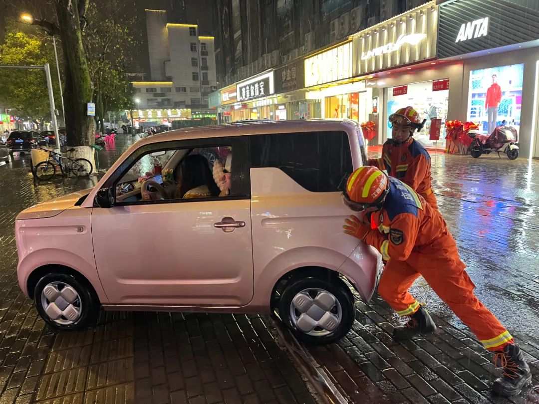 合力推出暴雨中的车辆。