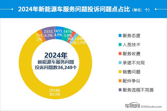 关于新能源汽车服务问题的投诉数量 2024 年增长率翻了一番,主要与服务质量、人员技术、销售问题有关,三者的投诉问题相比, 2023 年各自上涨 77%、72.1% 和 57.4%。在这些问题中,投诉问题在销售问题上的比例仍然远远领先于其它服务问题,已经超过了总数。 8 成。