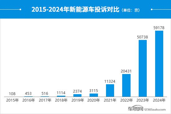 新能源车近 10 多年来,整体投诉量呈现出快速上升的趋势,特别是在 2023 年度爆发式增长,直接进入“ 5 万宗时代”。2024 年度投诉量再创新高,但同比增速明显下降。