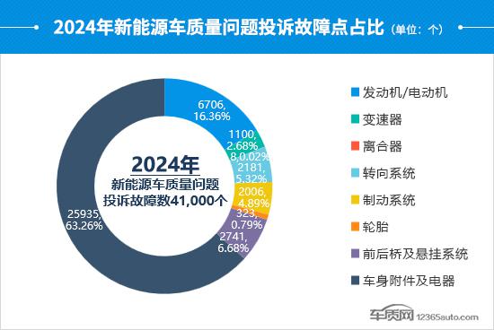 在 2024 在2008年新能源汽车质量问题投诉故障点的比例中,车身附件和电器仍然遥遥领先,占比已经超过总数。 6 成,同比增长 11.16 %。另外,变速箱、转向系统的投诉故障点同比大幅增加,各自比较 2023 年上涨 43.4% 和 63%,但是占比仍然保持在个位。发动机同时发动机 / 电动机比例大幅缩水,与 2023 一年比一年减少 18.62 %,投诉故障数量同比减少 61.4%。