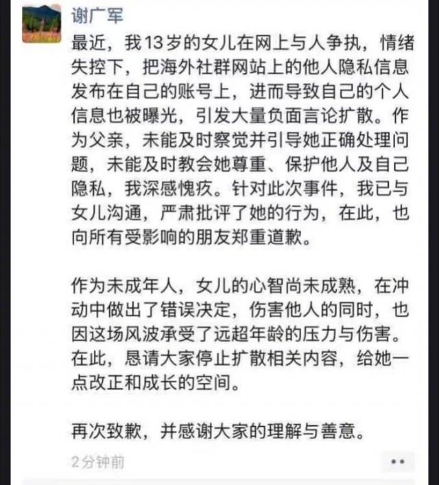IT 世家 3 月 18 百度副总裁谢广军昨天在微信朋友圈发了一条消息,说他发现自己 13 一岁的女儿在网上与人争吵时发布了他人的隐私信息,对此深感抱歉,并向所有受影响的朋友郑重道歉。