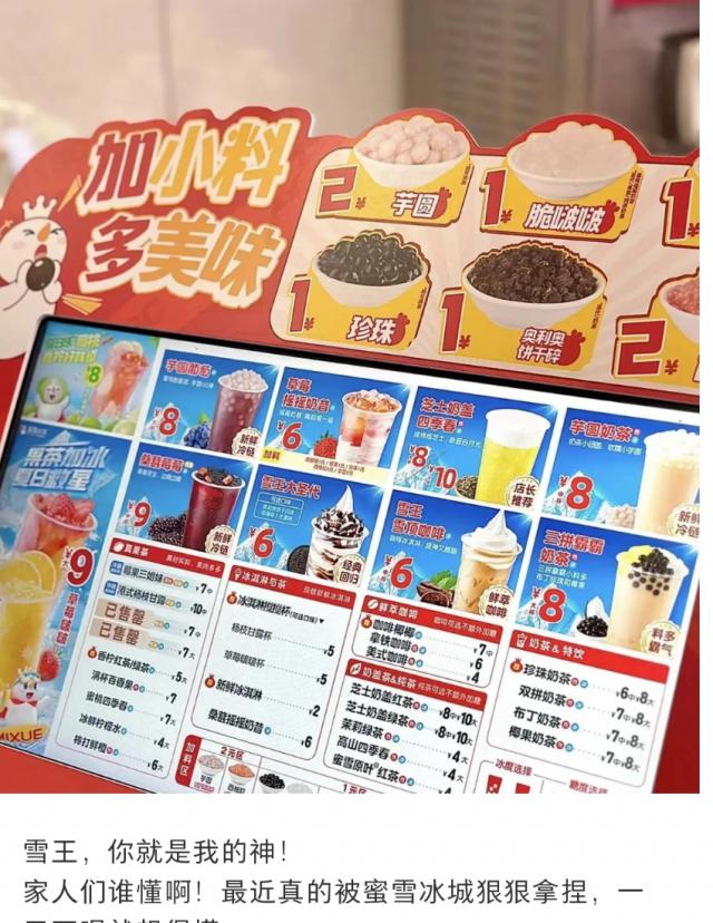 归根结底还是它长期积累的品牌滤镜闹事。2 元甜筒、4 元柠檬汁、6 元珍珠奶茶,蜜雪冰城用自己的力量完成了“廉价奶茶自由”,价格打遍了市场。