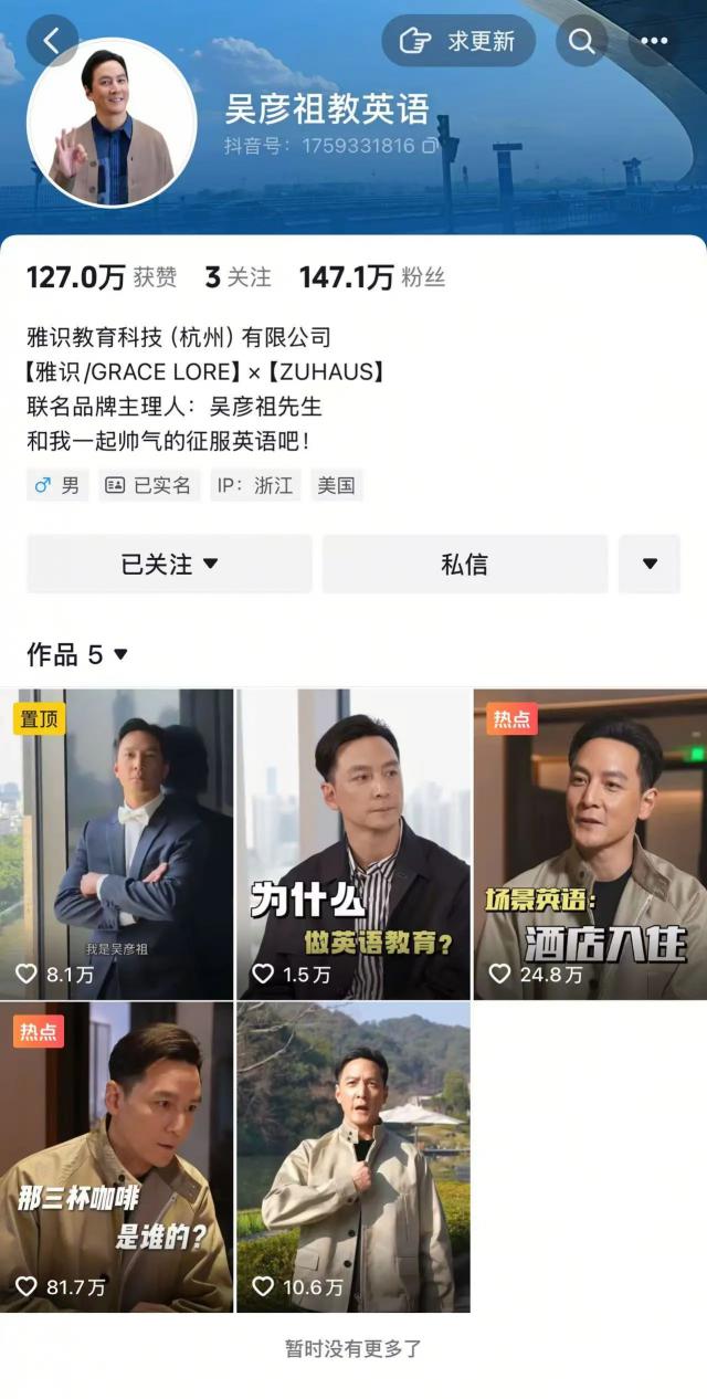 与此同时,他还在抖音设立了专属帐号“吴彦祖教英语”,为自己的课程宣传创造势头,至今已获得。 140 上万粉丝,发布 5 近距离获取视频 125 万点赞。