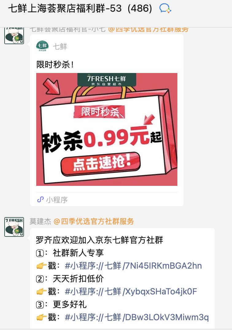 最近,七鲜在上海的扩张尤为激进。为了扩大新客户,七鲜推出了小规模但高密度的推送。住在JD.COM七鲜超市上海聚集店周边的消费者,从春节开始就明显感受到了更多的促销和新活动,比如新客户59减15。、各种拉新活动,如49减10、0.9元整点秒杀等。一地推人员告诉《窄播》,七鲜提供半小时到家服务,今年至少要在上海设置60个前置仓库。