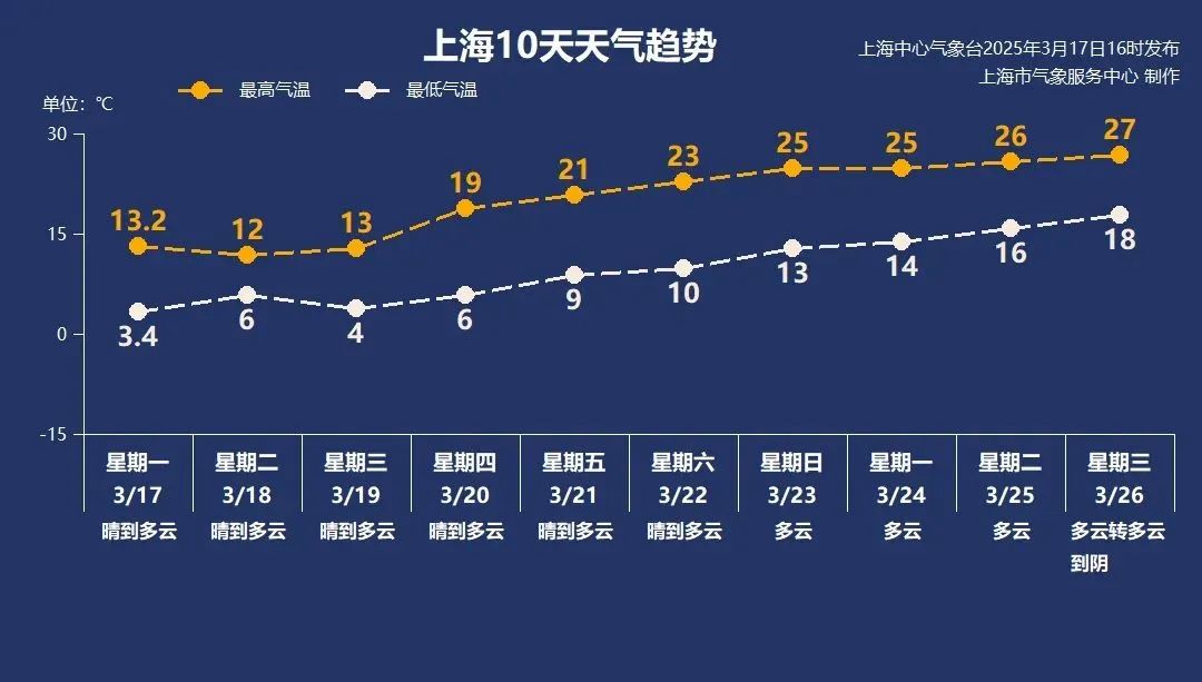 接下来的十天,上海主要是晴天或多云天气,干燥少雨。周三气温还是比较低的。周三上午,市区最低气温在4℃左右。郊区靠近冰点,白天有薄冰,最高气温13℃。从周四开始,当地气温大幅上升。本周末最高气温一路上升近25℃,下周中期最高气温甚至可达27℃。上海的天气在一周内提供了“冬-春-夏”的终极体验。