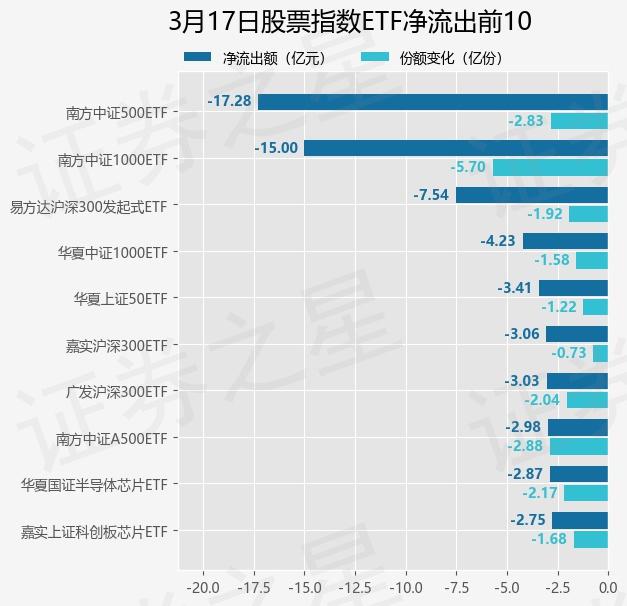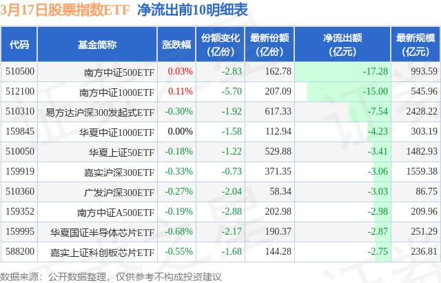 当天有 358 只股票指数 ETF 资金净流出出现在基金中,其中净流出排名第一的是南方中证 500ETF(510500)减少了份额 2.83 一亿份,净流出额为 17.28 亿元。