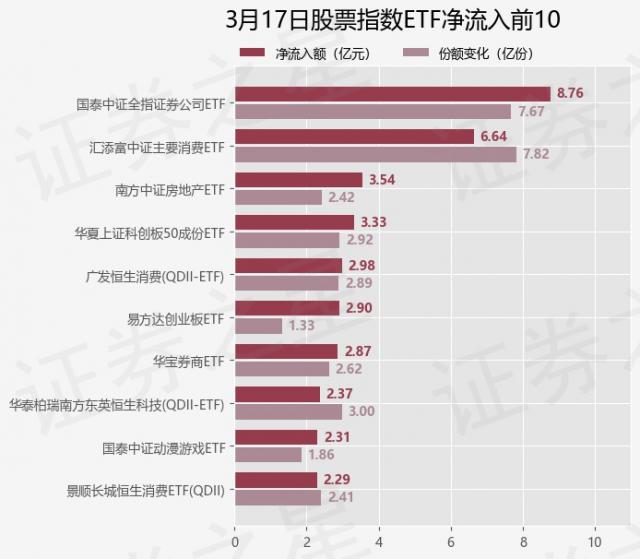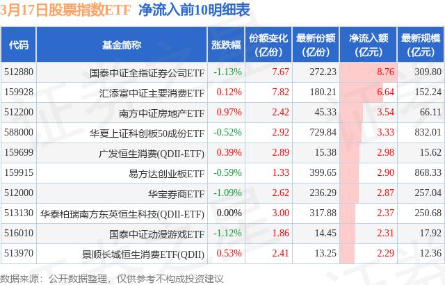 当天有 247 只股票指数 ETF 资金净流入出现,其中国泰中证全指证券公司净流入排名第一。 ETF(512880),份额增加 7.67 十亿份,净流入额为 8.76 亿元。