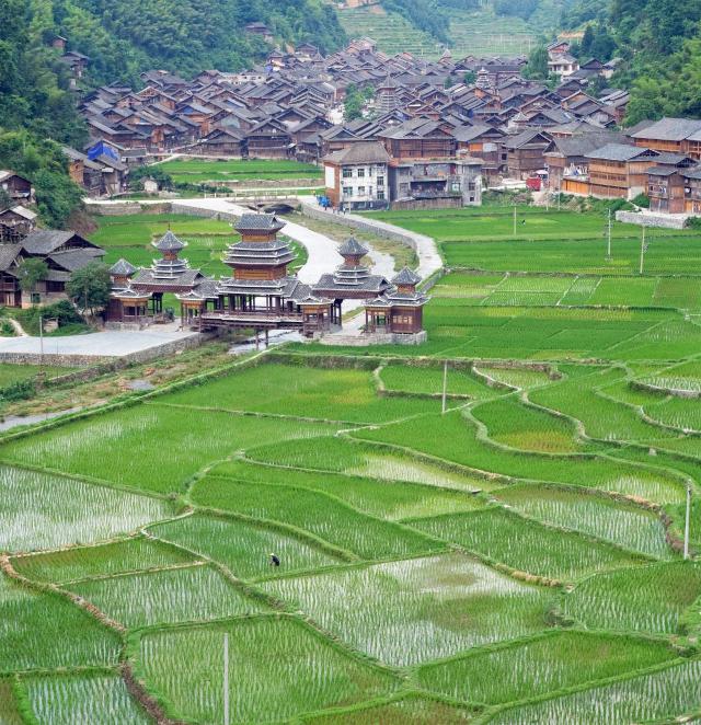 侗族村庄依山傍水,村庄边缘或竹子成林,或古树参天,或桃李满天;小溪环绕,或穿过村庄,“风雨桥”横跨其上,宛如天堂的入口。