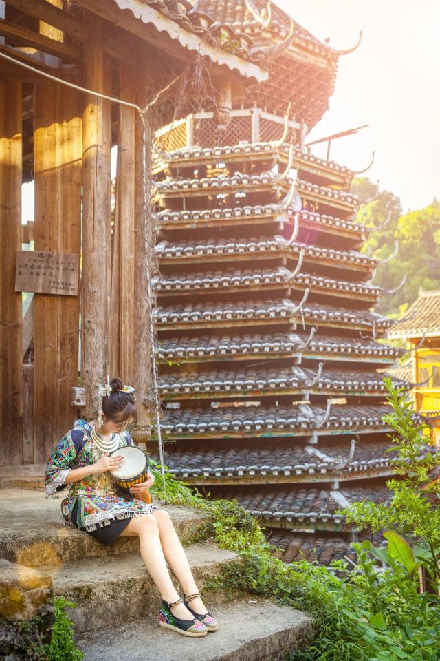 鼓楼的尖形装饰有葫芦和鹤,寓意吉祥和幸福,历史悠久。侗族的大歌在鼓楼的日月里飘了出来,说着万物与美的秘语。