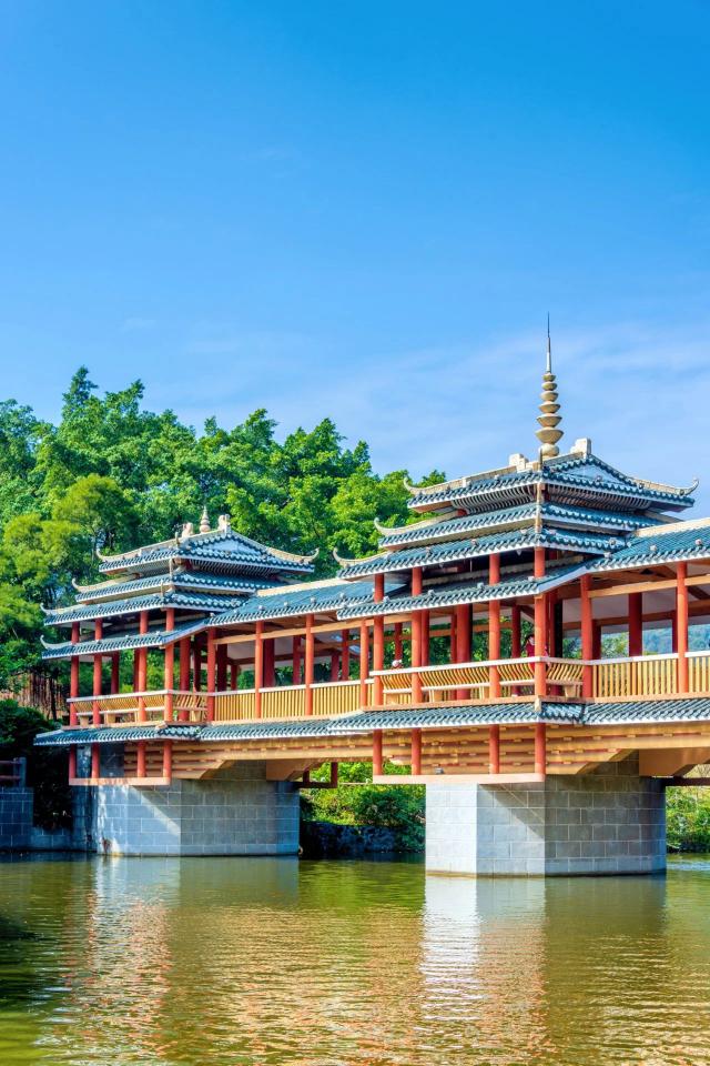 桥梁、亭台楼阁融为一体,采用侗族木结构建筑技艺;其中,被郭沫若先生命名的程阳风雨桥是世界四大历史名桥之一,被誉为“世界木桥之最”。