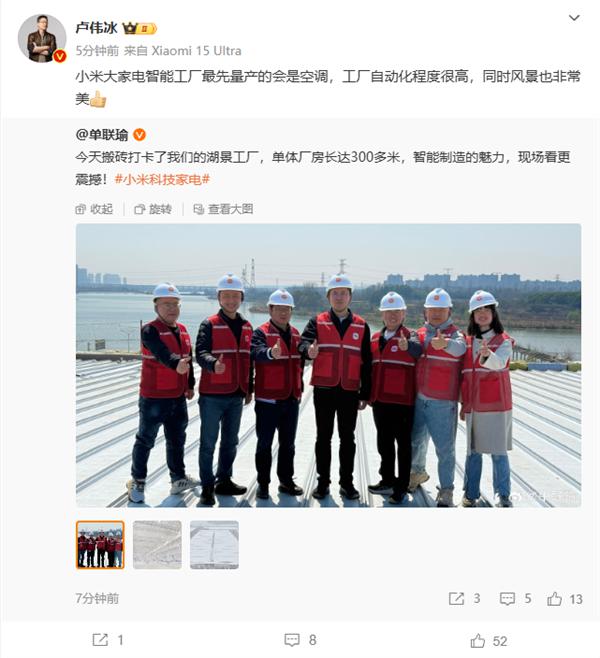 小米集团总裁卢伟冰分享,并补充道:“小米大家电智能厂首次量产空调,工厂自动化程度很高,同时风景也很美。"