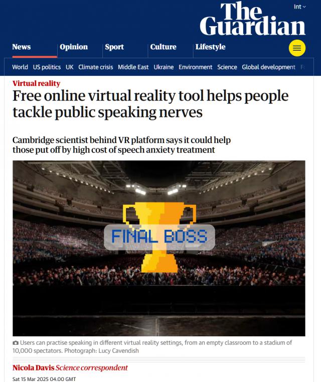 IT 世家 3 月 17 据英国《卫报》当地时间报道 15 据日报报道,剑桥大学沉浸式技术实验室创始人克里斯・麦克唐纳博士开发了一个免费的在线平台,演讲者可以在那里在千余名虚拟观众面前训练有助于缓解在公共场所的焦虑和紧张。