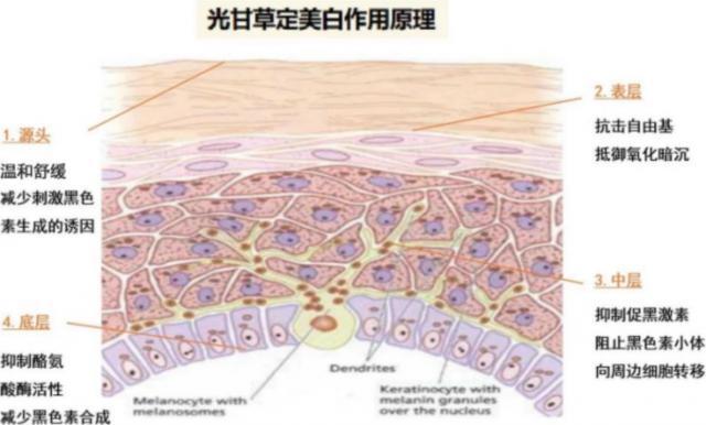 可以总结一下:就美白效果而言,光甘草定>烟酰胺>熊果苷及 VC 乙基醚。可以从源头上抑制酪氨酸酶的活性,阻止黑色素的产生,还可以恢复和清除已经产生的黑色素,降低胆固醇,防止皮肤氧化暗沉。