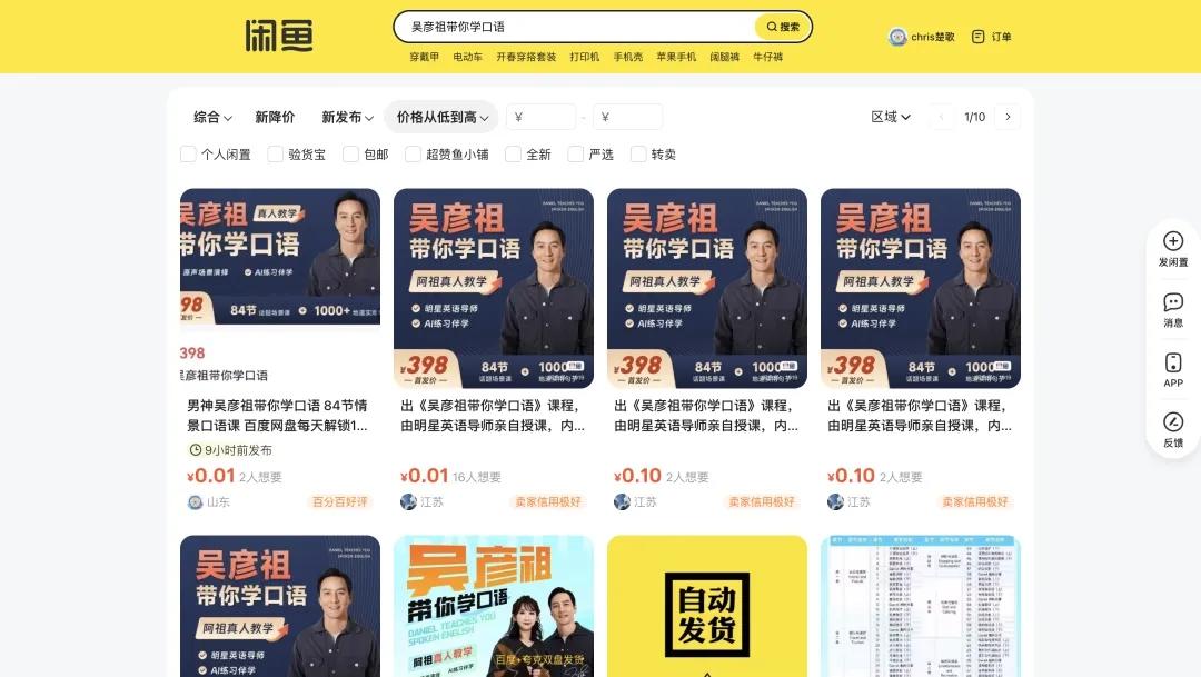 这一举动让阿祖受到了“割韭菜”的质疑。然而,从具体数据来看,阿祖的英语课并没有想象中那么受欢迎。流口水的男神很多,但真正愿意掏腰包的却很少。与其在官方下单,人们更愿意在闲鱼上购买录播,录播价格低廉,价格在0.01-58元左右。“吴彦祖盗版网络课程成为二手平台爆款”的词条也火上了热搜。