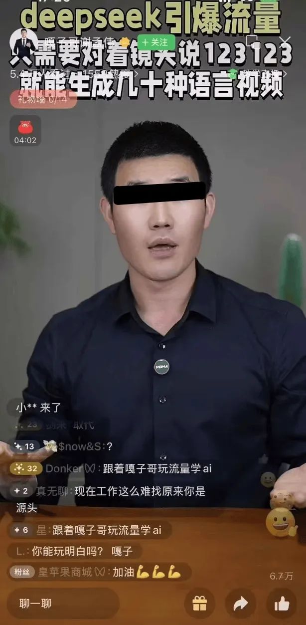 举例来说,凭借在《兵线张嘎》中扮演“嘎子”而走红的谢孟伟,最近完美地诠释了什么是“网络的尽头是卖课”。通过转售AI课程,他成功地获得了一波流量。根据直播截图,他在直播间声称“deepseek引爆流量,只要对着镜头说123123,就可以生成几十个语言视频”,从而引流销售10.9个“DeepSeek课程”。事实上,这门学科与他本人关系不大,就像他以前卖酒卖手机一样,都是返利推广。