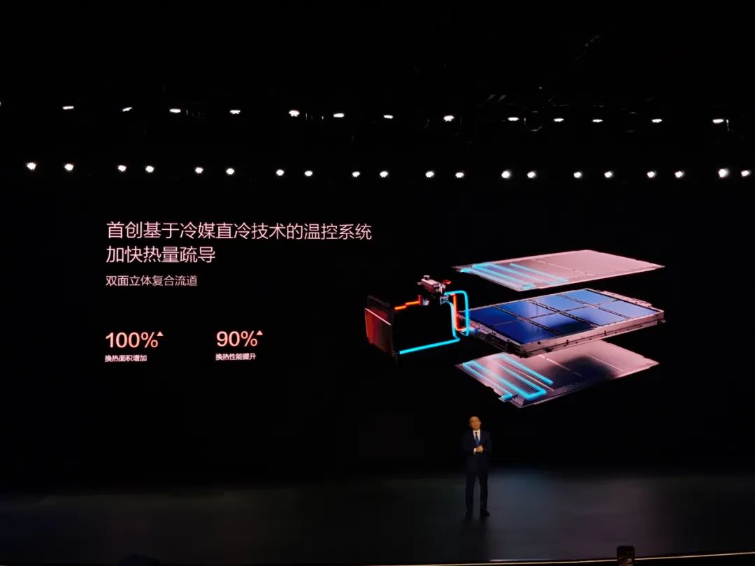 与大多数电池公司在PACK系统中常用的液体冷却技术不同,比亚迪使用的是直冷直热的制冷剂材料。制冷剂虽然不能加热,但是可以更快的降温。在新闻发布会上的介绍中,闪充电池系统采用两种制冷剂进行冷却,热交换面积增加100%,热交换性能增加90%。